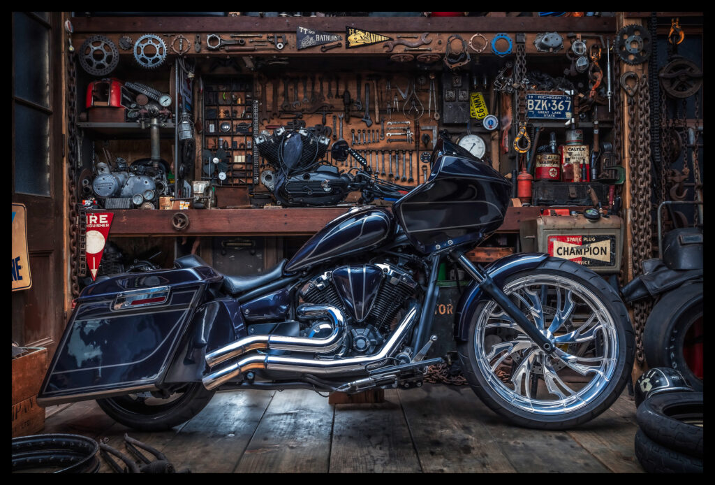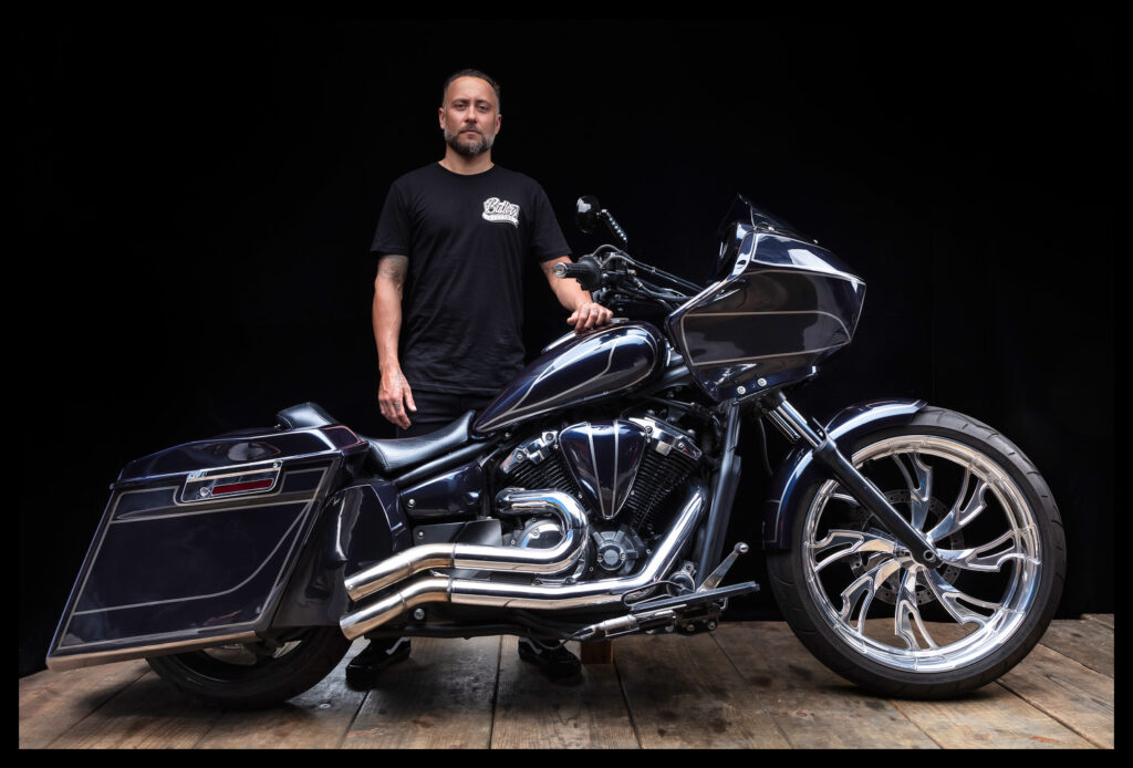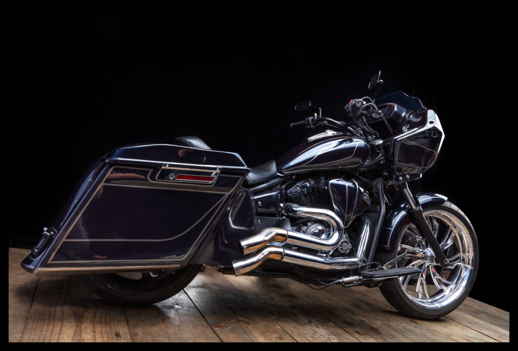 This Yamaha Stryker was brought into the shop by an awesome bloke named John. After chatting with John about all his ideas for the build, I sat down and started designing. John’s only real wishes were a low riding bagger based off a Harley Road Glide and for it to be blue. The rest he said was up to me.