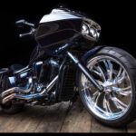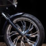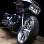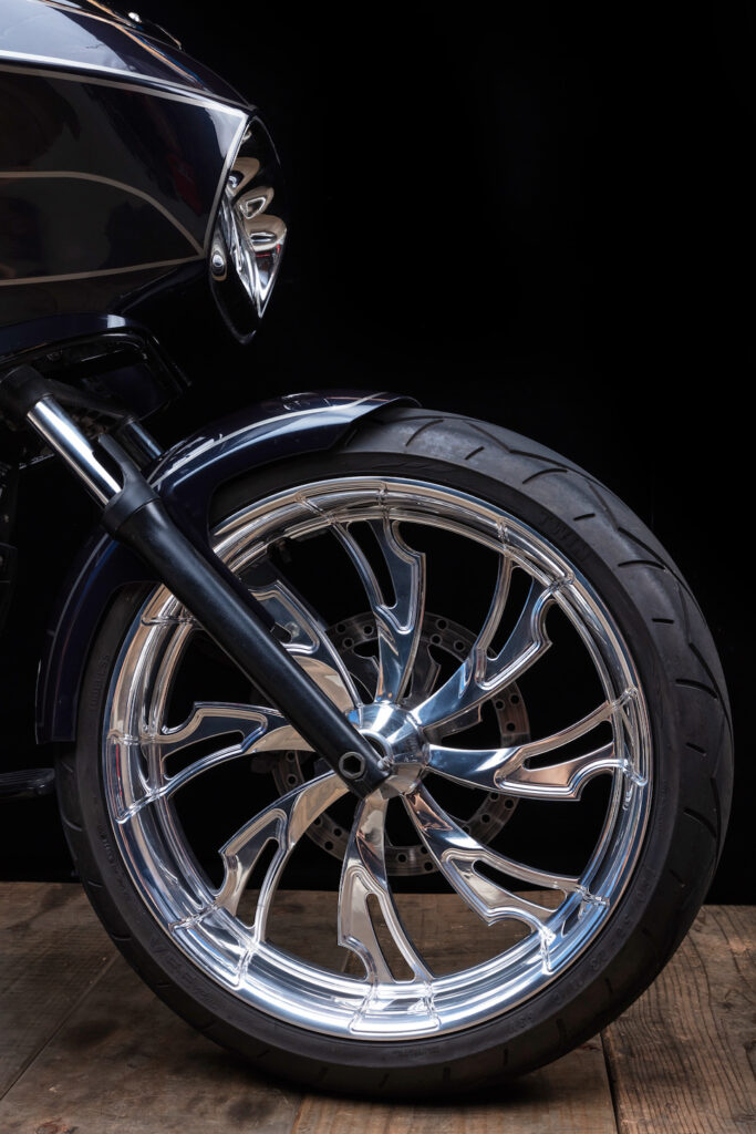 A one off, first ever in Australia 23×5.5 inch full billet aluminium front wheel was designed and custom made from the USA, fitted to the bike along with a hand made front fender, painted to match the midnight blue paint.