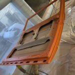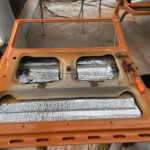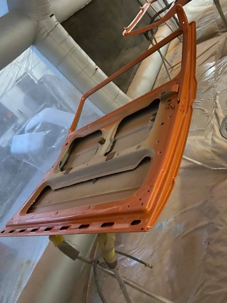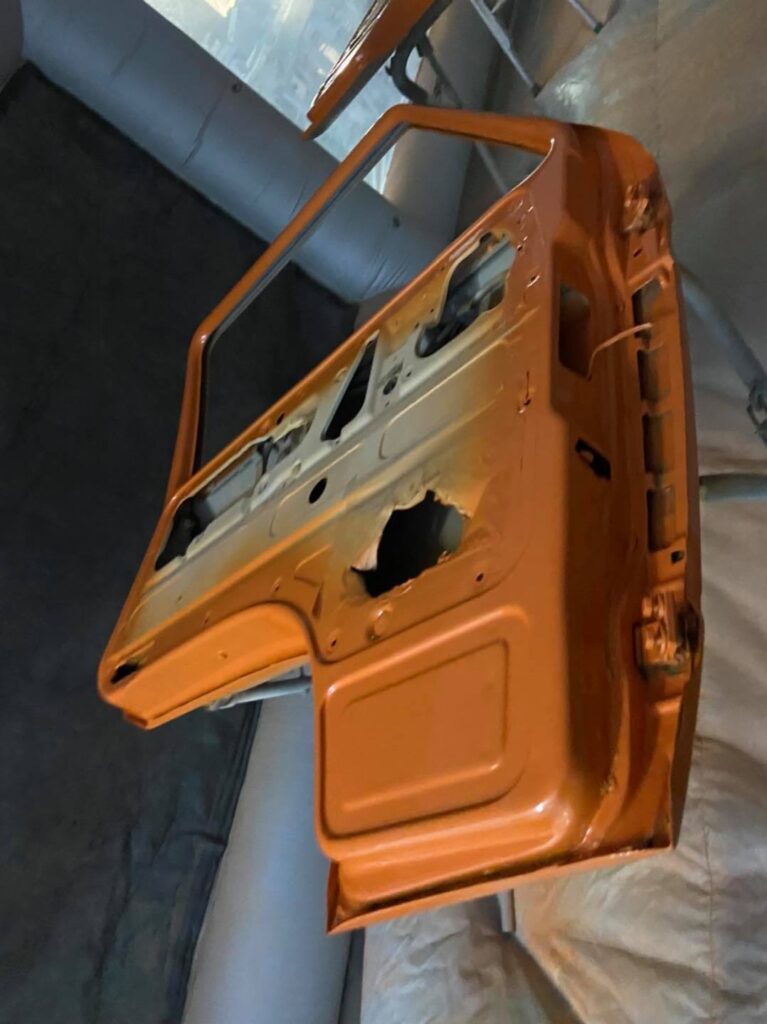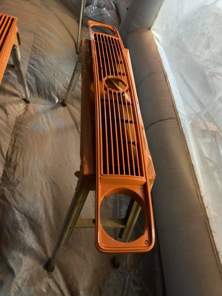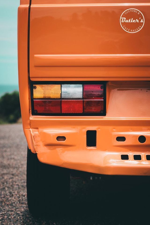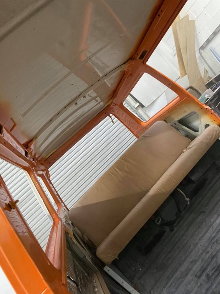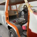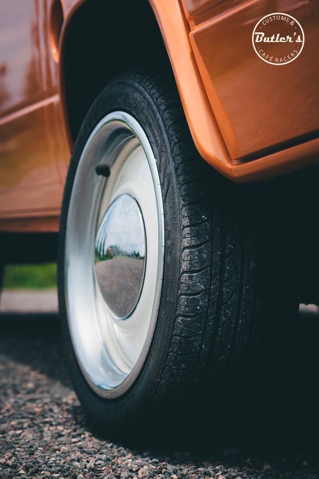 After deciding on a bright retro orange with an off white roof the car screamed for so much more. So we decided to replace the stock 14 inch wheels with a set of Smoothie style 17×8 steel wheels with chrome hub caps and trim rings, new tyres to match and we colour coated the rims to match the exterior roof off white.