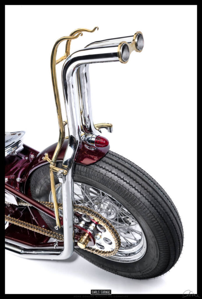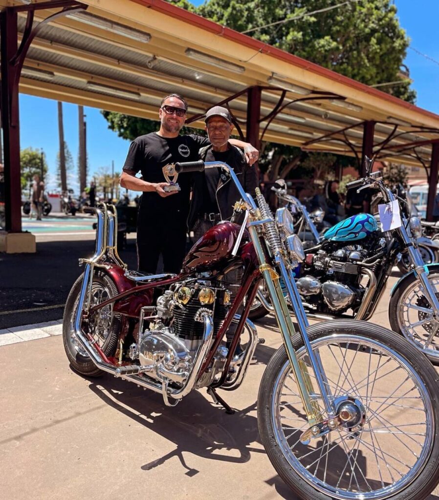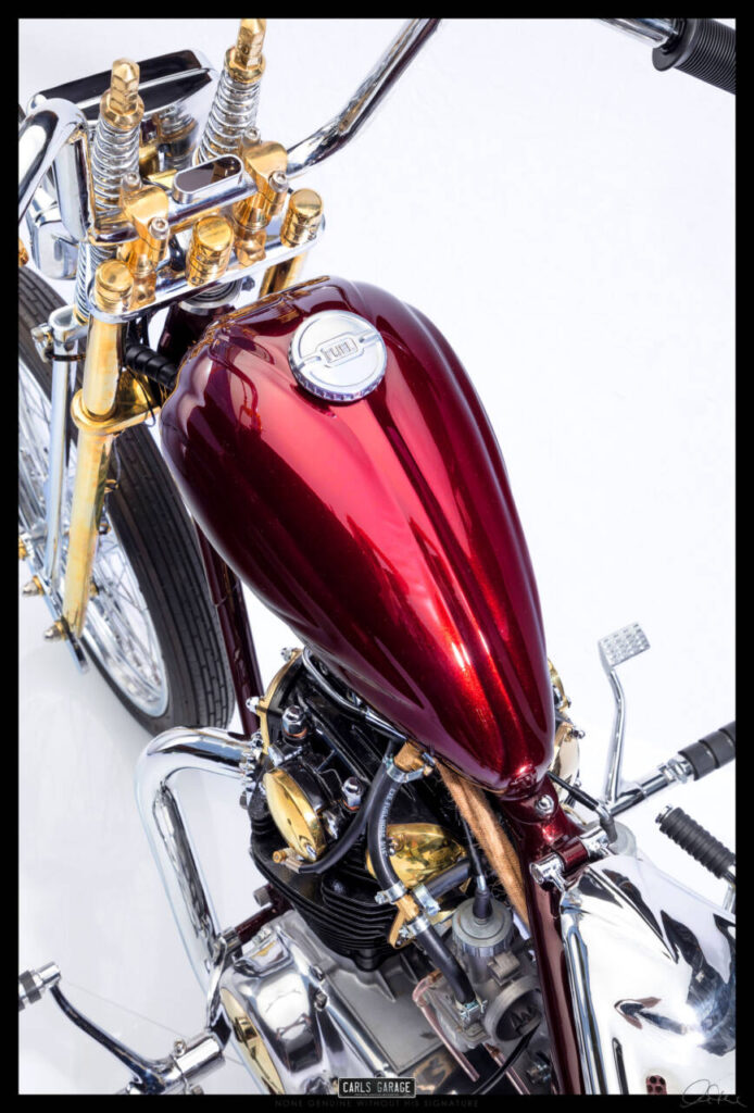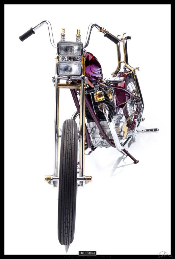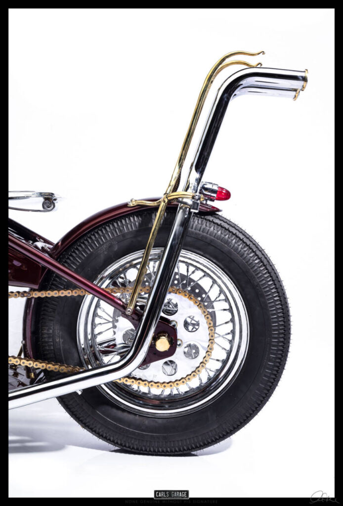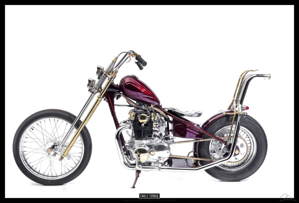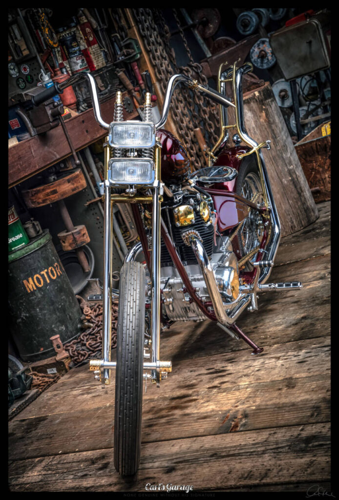 He first asked me if I could fit the electronic ignition and wire it up. After doing so on day one Rodney turned up to see the job and asked me what would you do if you were to custom build this bike. I replied, it all depends on budget, but if you are willing to spend what ever is needed and let me have creative freedom I’ll build you an award winning one off show bike chopper. He loved the idea and the rest is history.