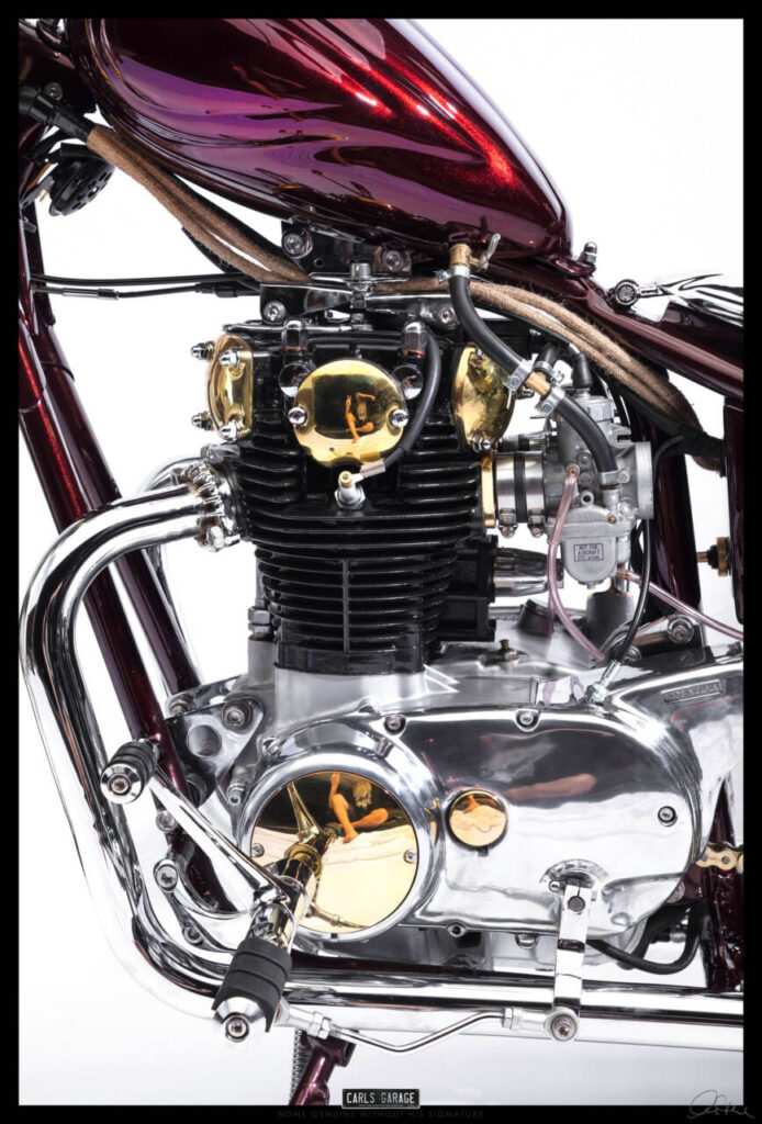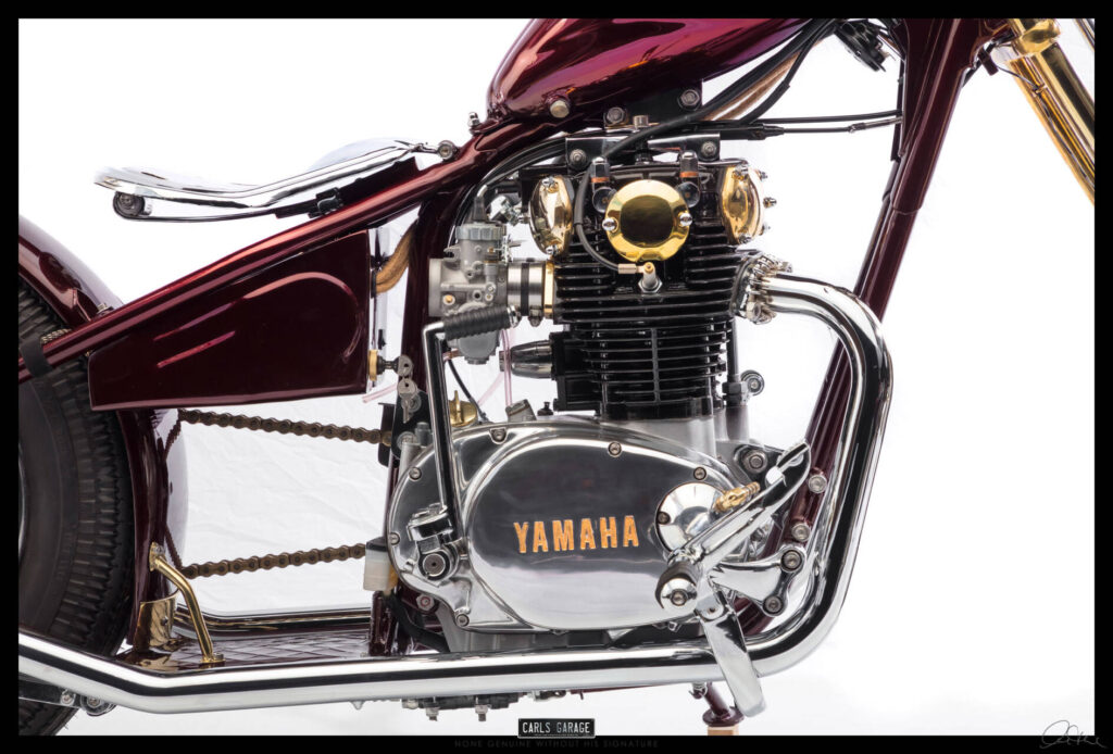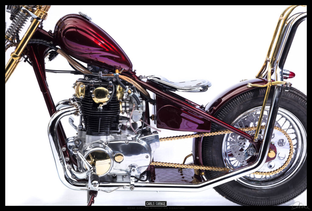 While the frame was off to paint with the rest of the parts like tank and fender and so on, I took all parts like the hand made sissy bar, custom exhaust system and engine components to chrome and brass plating . Once all the parts were plated it was time to assemble the bike. Finishing the bike at 12am I took the bike to a custom bike show at 9am and managed to take away a trophy for best custom . And now it was off to the owner Rodney’s for its new life as a one of a kind Custom XS650s.