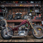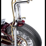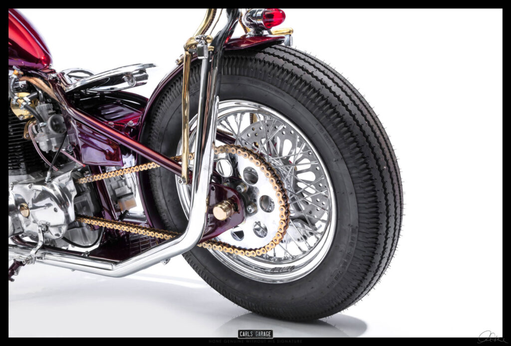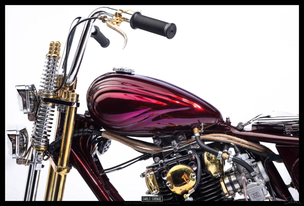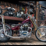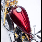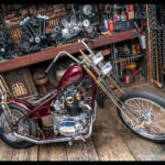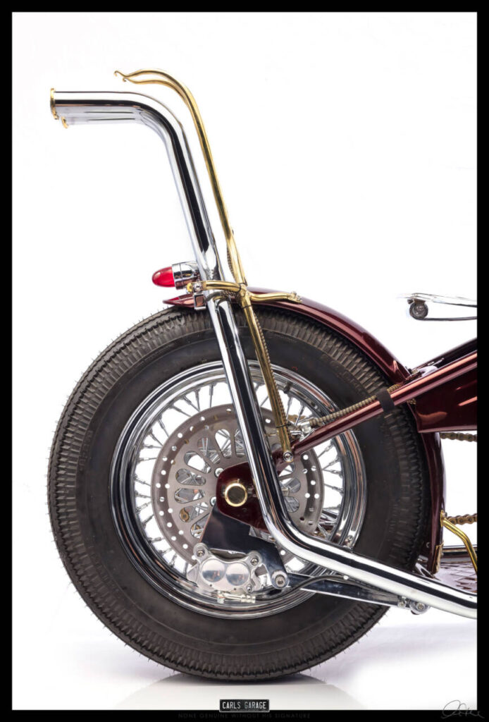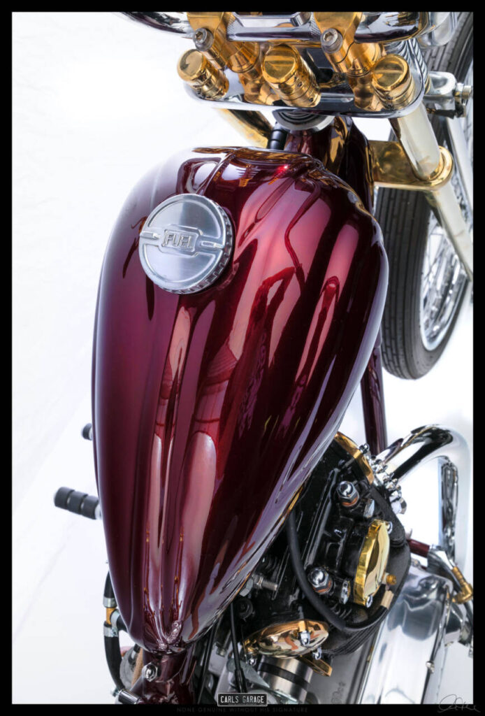 I had always had the idea to build an all hand crafted chopper. Making every inch of the bike it’s on show piece. So starting with the tank I decided to make a tank that was unlike anything iv ever seen. Bead rolling, English wheeling, hammering sheet metal for 35-40 hours shaping a tank with art deco curves and design aspects. After making the tank I purchased new wheels from lowbrow customs, then started to strip the bike back to its bare bones.