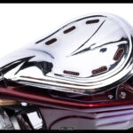 After completing the tear down it was now time to make a seat for the bike and rear fender. Starting again with a hammer and leather bag I started beating and shaping metal to create an all steel custom seat pan and hand rolled rear fender. Then moved on to the custom bead rolled battery box and bead rolled lower frame plate.